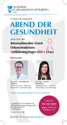 Wir laden Sie ganz herzlich zum „Abend der Gesundheit“ anlässlich des Internationalen Brust- Rekonstruktions- Aufklärungstages (BRA-Day) in unserer neuen Cafeteria im „EV“ ein.